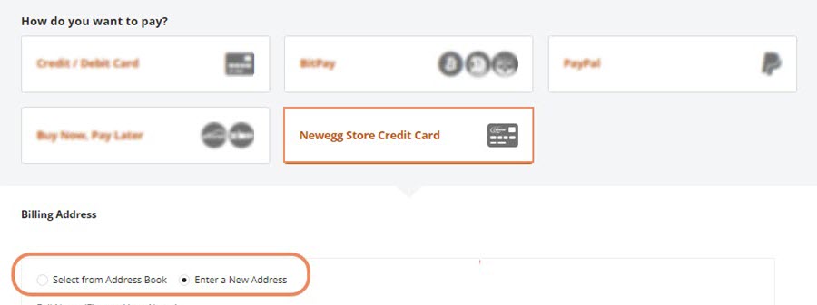 - For first-time Newegg Store Credit Card customers purchasing from us, enter a new billing address before saving and placing the order.